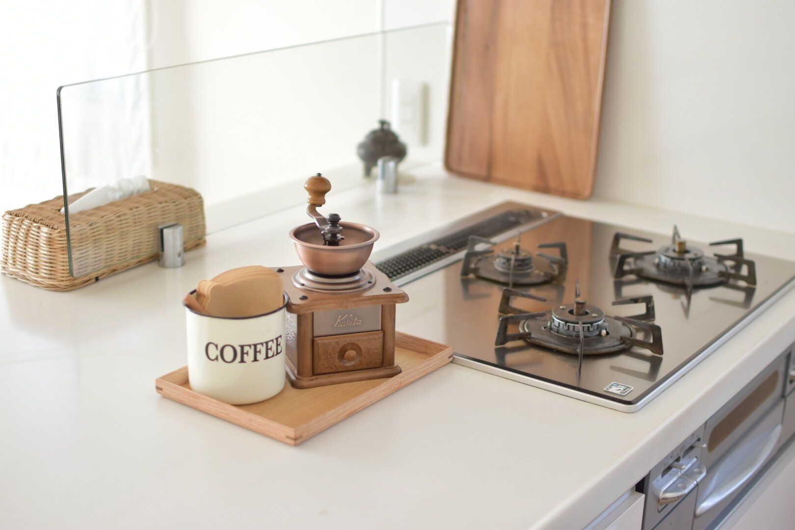 コーヒーを飲むときに使うグッズも一緒に置いて使いやすい状態に。ちなみに無印良品の木製トレーがめちゃくちゃ使えます。コンパクトなサイズで安定感もばっちり。