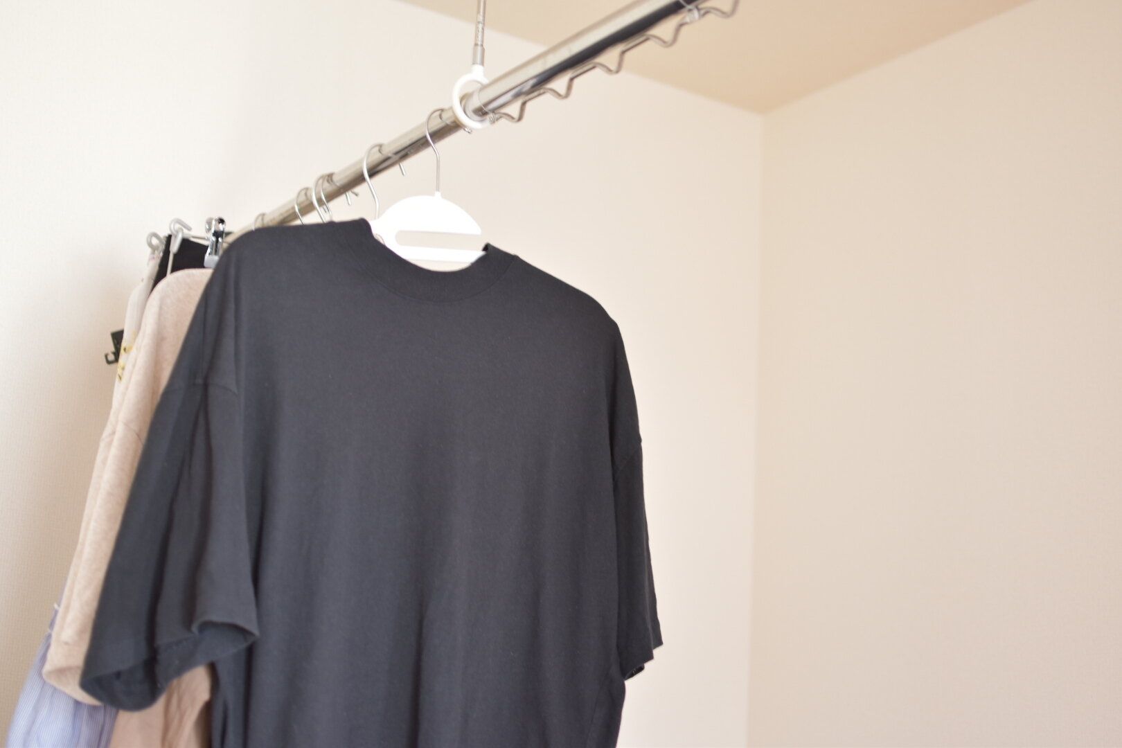 干す場所がないなら、つくればいい!と考え、洗濯ものを干すスペースを増やしました。ニトリやホームセンターにいくと洗濯用の強力突っ張り棒が販売されています。部屋干しにすると天候にも左右させず、好きなタイミングで片づけることができます。