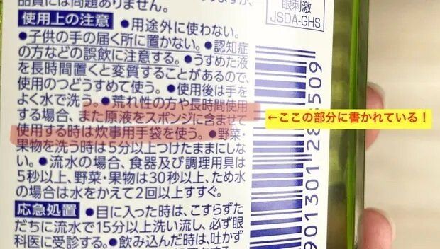 食器用中性洗剤(参考:「キュキュット」)のパッケージ説明欄を見ると、「原液をスポンジに含ませて使用する時は炊事用手袋を使う」とあります。