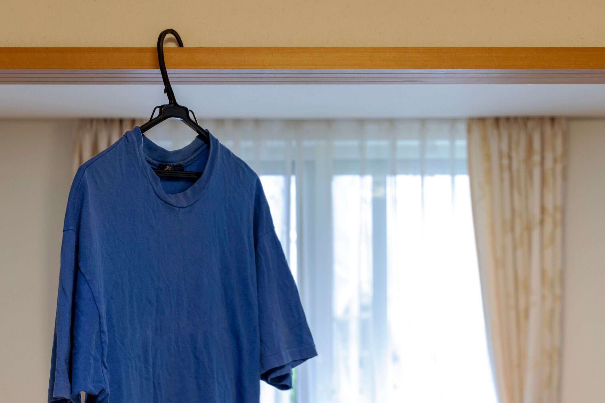 Tシャツを干すときには胴体の部分をハンガーや物干し竿に引っかけると、型崩れを防ぐことができます。乾きにくい脇も広がって、素早く乾かすことができます。
