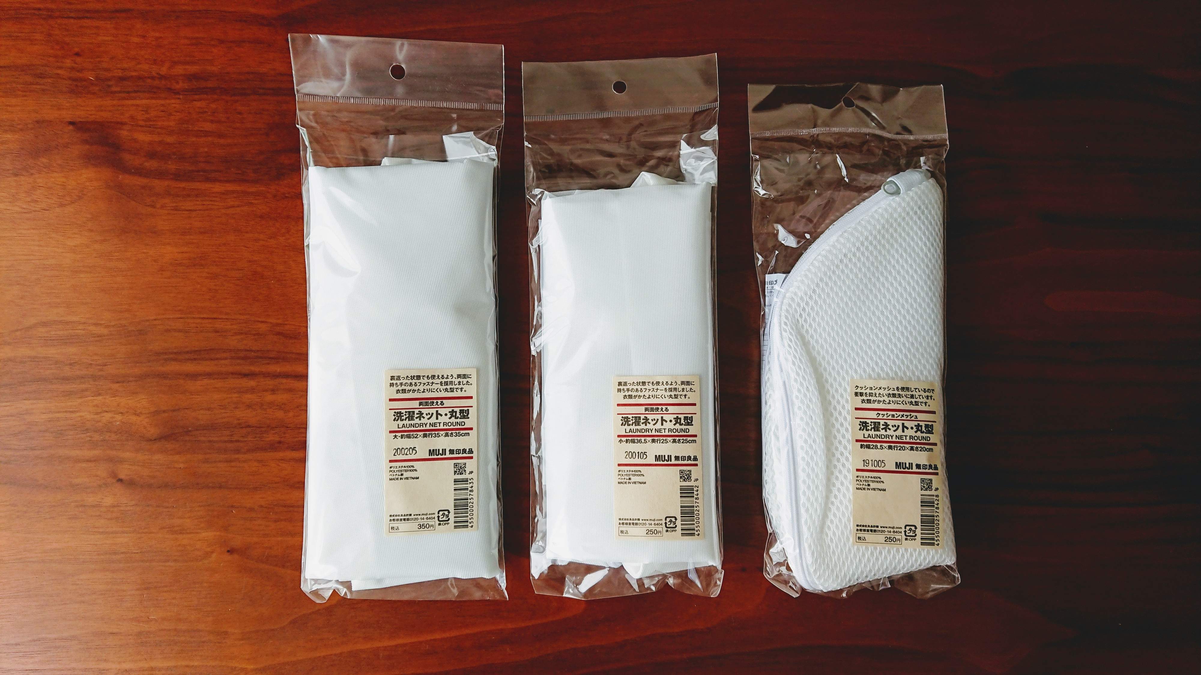 無印良品の「洗濯ネット・丸型」シリーズは、見た目スッキリ&使いやすさ抜群なうえに、価格もリーズナブル。今回は以下の3種を購入しました。
