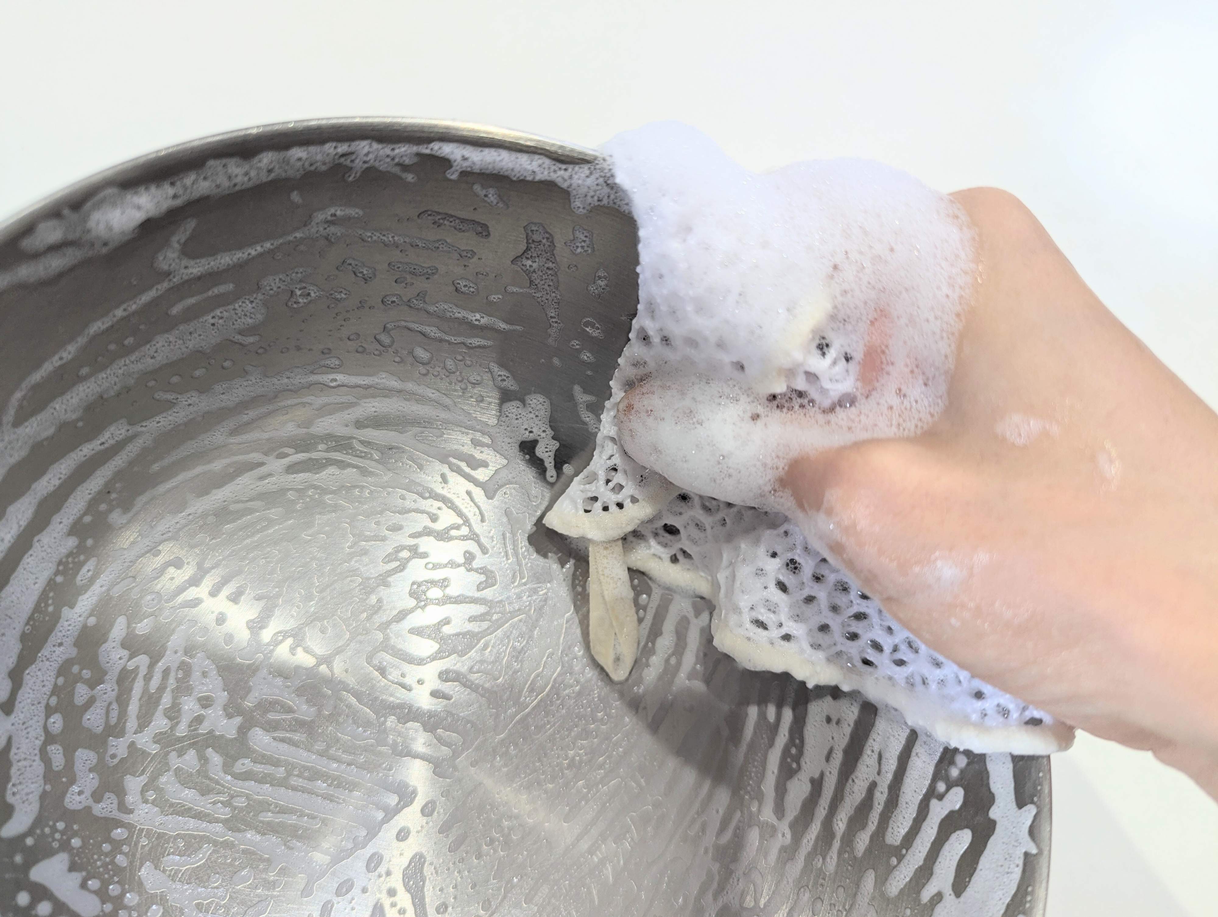 一般的なスポンジと比べると、あみたわしは泡立ちがいまいちと言われることも。けれど、あみ目同士をこすれば、モコモコとまではいかなくても、洗い物に必要な泡は十分立ちます。