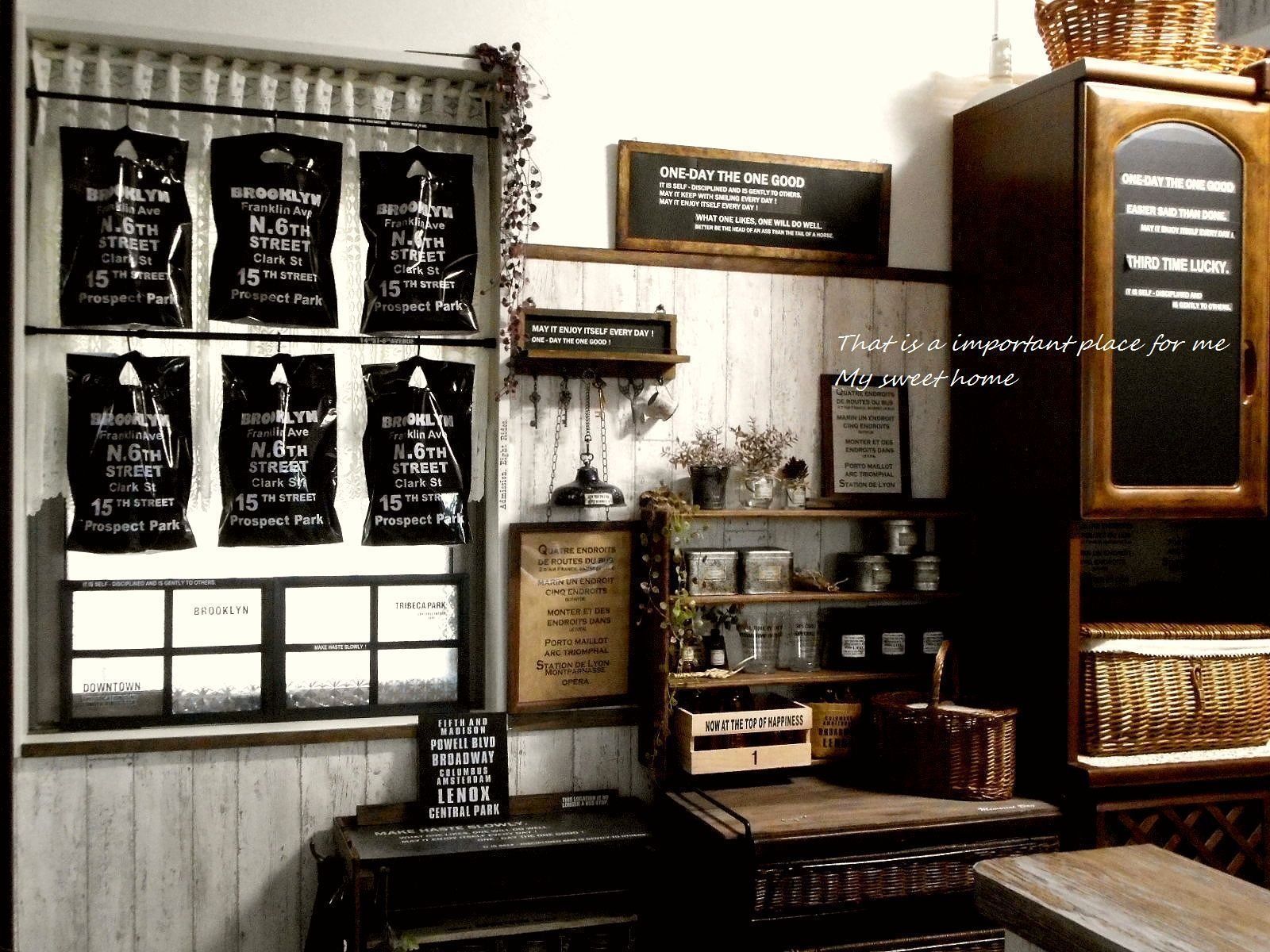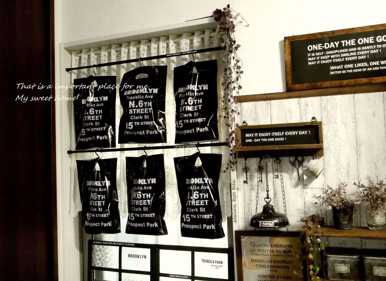 ブロガーの我が家さんは、窓枠内のデッドスペースに突っ張り棒を取り付け、セリアのビニール袋をかけて壁面収納をつくりました。ビニール袋の中には、排水溝ネットや替えのフィルター、ゴム手袋など、さっと取り出したい軽いものをしまっています。突っ張り棒とビニールの色を黒で統一した、カッコイイ魅せる収納ですね!