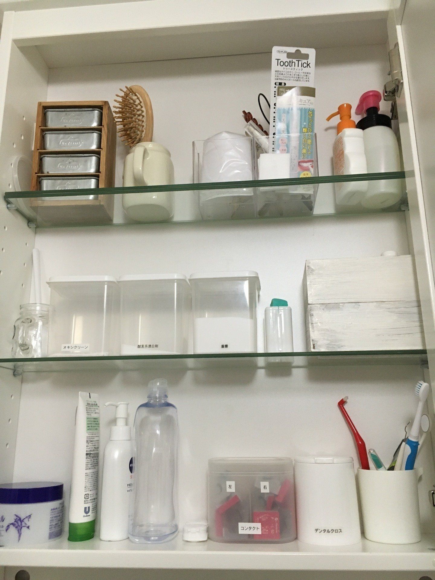 ブロガーのHitomiさんは、洗面台の上にIKEAのミラーキャビネットを設置し、扉内の収納を有効活用しています。1段目には歯ブラシなどよく使うもの、2段目にはオキシクリーンや重層などのクリーニンググッズ、3段目にはヘアワックスなどあまり使わないものを。スッキリ見えるだけでなく、とても使いやすい収納なのだとか♪