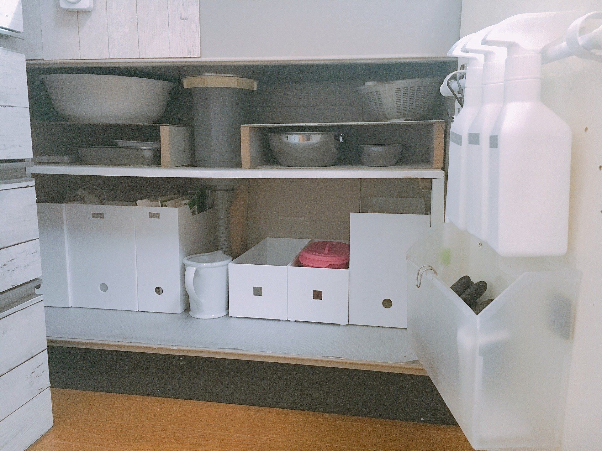 Hitomiさんは、シンク下収納の扉裏も活用しています。突っ張り棒とフックを取りつけて、洗剤や虫除けなどのスプレー類や、水筒を洗うグッズをかけられるようにしました。さらに下に取り付けたレターケースには、ゴム手袋などを入れています。よく使うものをサッと取り出したりしまったりできそうな、便利な収納アイデアですね。