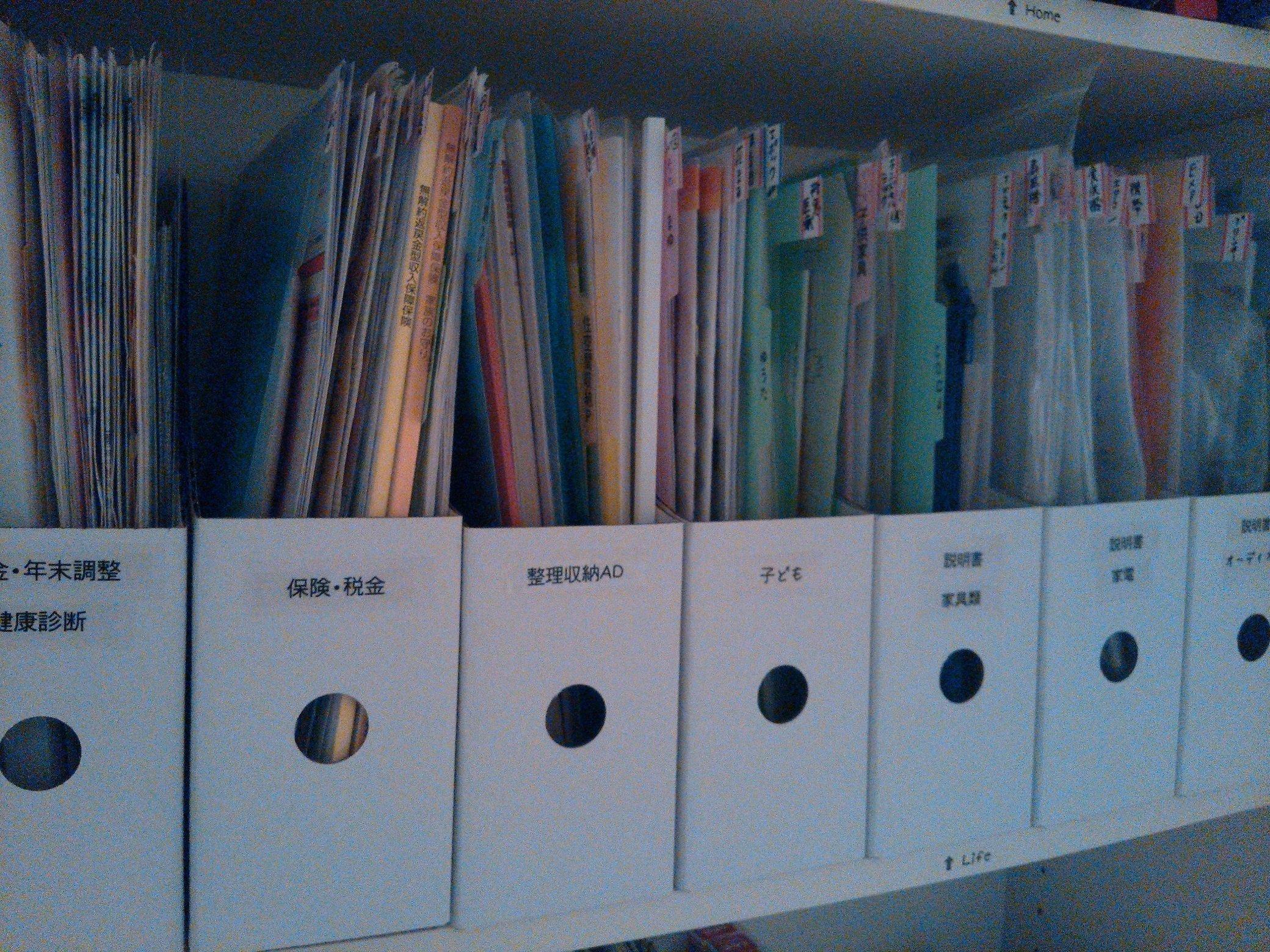 壁面収納に書類を保管しているのは、ブロガーのmichiyoさん。奥行きの狭い壁面収納のため、ファイルボックスを縦置きして、その中にクリアファイルを入れて整理整頓しています。誰が見ても中身がわかるように、ボックスにはメンディングテープでラベルを、クリアファイルには男女で色分けしたインデックスをつけておくのがコツです。
