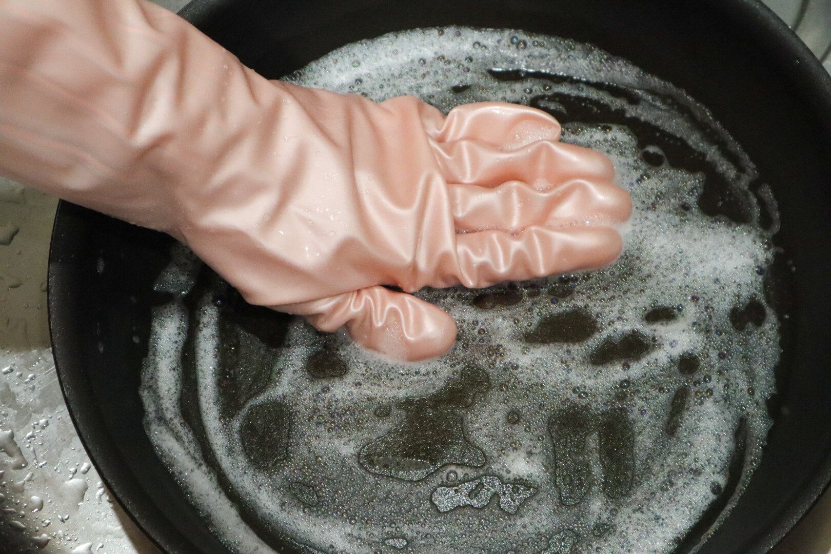 炒め物をしたあとのフライパンや、カレーを作った後の鍋は、サーッと洗剤をまいたらスポンジを使わず、手袋をつけた手で下洗いをします。