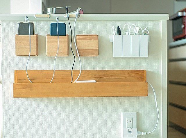 つめ切り、体温計、スマホの充電器など、家族共有で使うものは、みんなが通る場所の壁にまとめて収納。いちいち置き場所を答えたり、取りに行くストレスから解放されました。(インスタグラマー えりかさん)