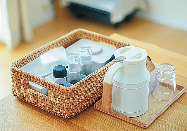 食卓で使う調味料類はかごに、水のポットとコップはトレーにまとめて常備。だれでもすぐ使える食堂式のセルフサービスなら、キッチンに取りに行く面倒が省け、片づけも楽に。(インスタグラマー mayuさん)