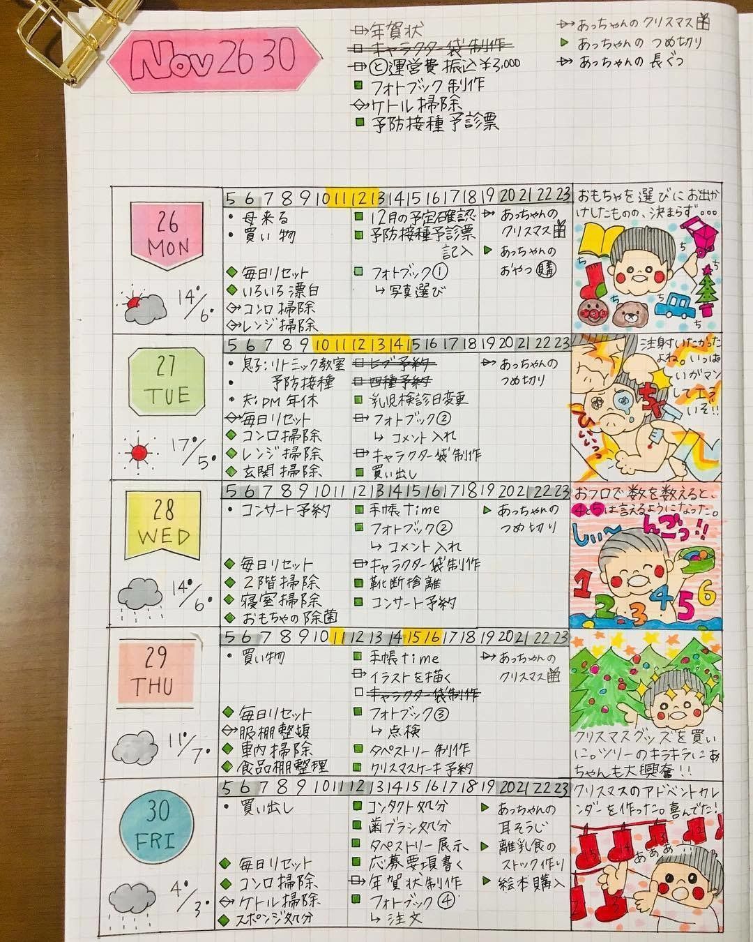 日付で区切り、その日行うことを時間別にリストアップ。行動する順番が分かりやすくスムーズに行えそうですね。プラスで、育児日記をイラストで描かれているのも素敵です!