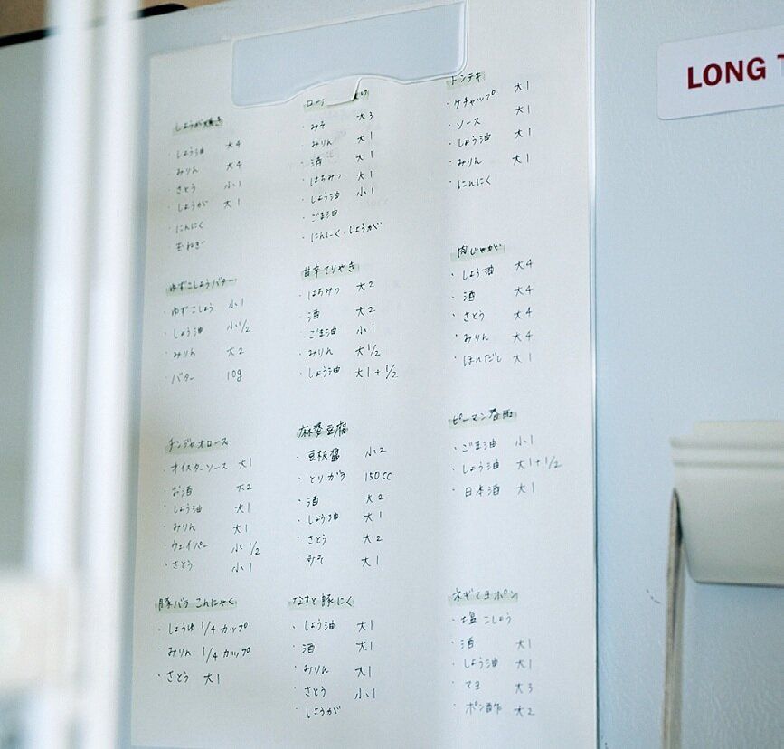 家族から評判がよかった料理をリスト化して、そのなかからつくっています。作り方はだいたい覚えているので、調味料の分量だけ書き出す形式に。パッとひと目でわかるので、便利ですよ。