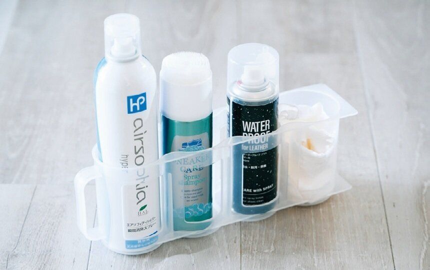 靴用の防水や汚れ落とし用のスプレーを缶ストッカーにIN。スプレー缶がげた箱の中で転がらず、取り出しやすさも超優秀。