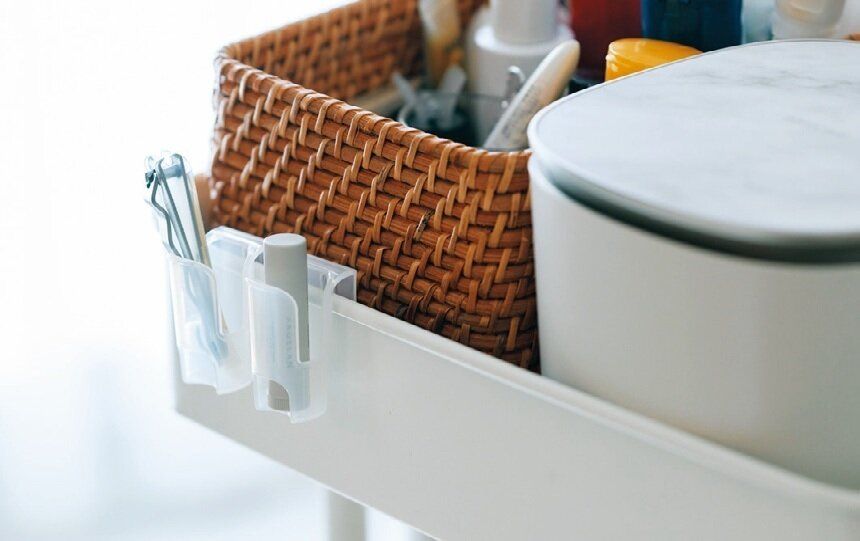 すぐに迷子になる小物は1個ずつ薬味ホルダーに入れて、見える場所に引っかけ。日用品を入れたワゴンの脇や洗面台の棚にかけています。