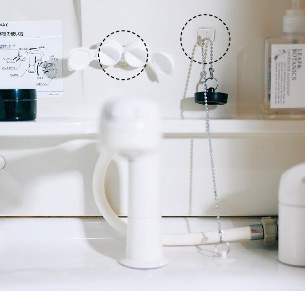 洗面ボウルの栓とチェーンは、とにかく邪魔。100円均一で買ったミニサイズの粘着フックを壁につけて引っかけ。ついでにコンタクトレンズケースも引っかければ、しっかり乾燥して衛生面で◎。