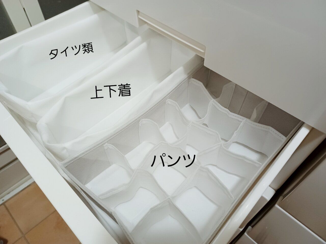 畳まずに衣装ケースの中に仕切りケースを入れて、その中にポイポイいれるだけの収納に替えました。