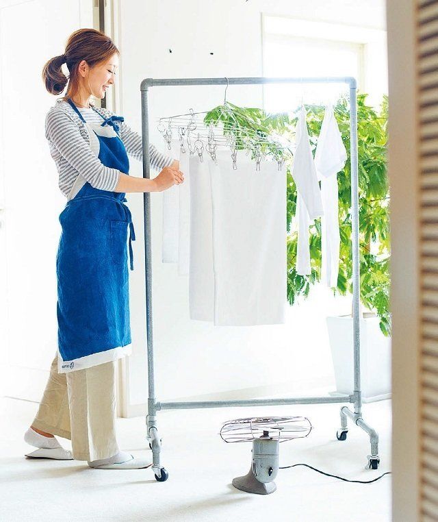 洗濯機のカビが付着した厚手のタオルは、生乾きになると臭いが発生。サーキュレーターや扇風機で下から風を当てると、乾くまでの時間が短縮され、菌の増殖を防げます。風がまんべんなく当たるよう蛇腹干しにしましょう。