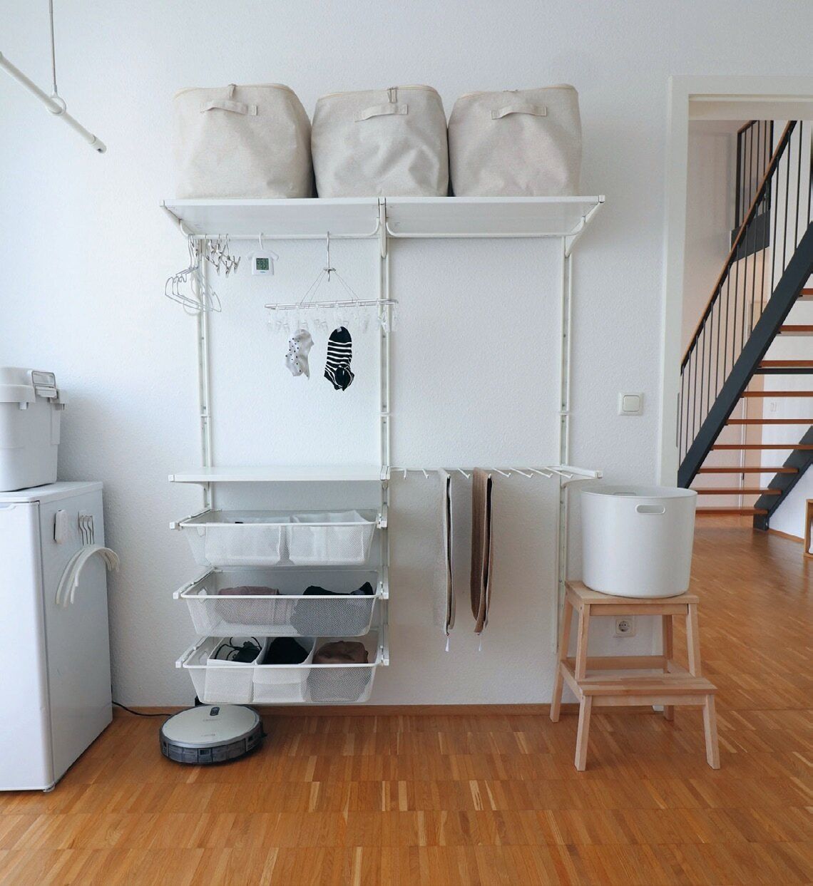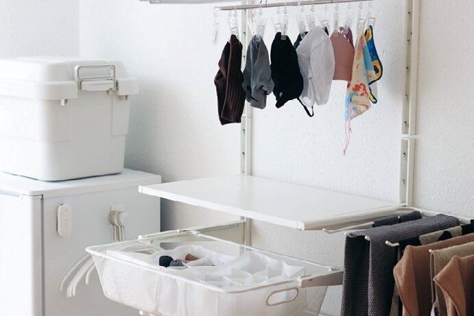 ドイツでは基本的に室内干しのため、IKEAの壁づけの棚を活用して洗濯物を干す場所に。「ピンチではさむ動作が減るだけで、干してたたんでしまうまでの作業が一気にラクになりました」。
