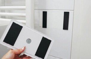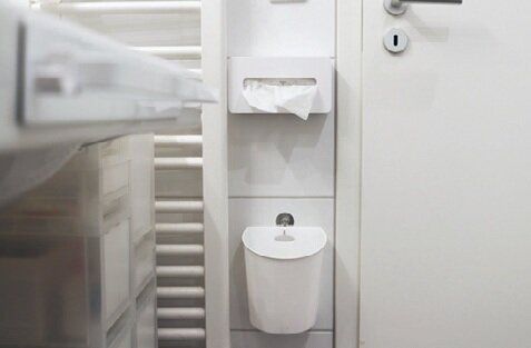 洗面所でよく使うティッシュ。「ゴミを捨てるときにいちいちかがむのが面倒」と、すぐ下に壁掛けできるゴミ箱を設置。ティッシュボックスもマグネットシートで壁に貼りつけ、洗面台をより広く。