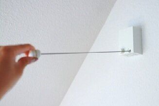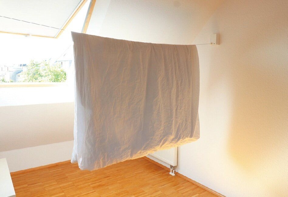 ふとんを干すためにベランダまで運ぶのが面倒と感じたnicoさん。室内干し用の伸縮ワイヤーを壁に取りつけ解決しました。「使うときだけ引っ張り出せばいいので、見た目も気になりません」。