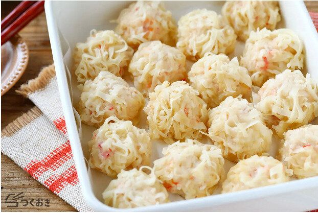 一見すると手間のかかりそうなシュウマイも、このレシピなら電子レンジで手軽につくることができます。成形して丸めたあんに、細く切ったシュウマイの皮をくっつけるだけなので、不器用さんでも失敗知らず。火を使わずに調理できるので、お子さんといっしょにつくっても楽しそうです。