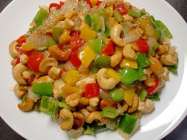 中華料理の人気メニューのひとつ、鶏肉とカシューナッツの炒め物。揚げたカシューナッツが香ばしく、野菜もたっぷりおいしく食べられます。パプリカとピーマンの彩りもきれいですね。