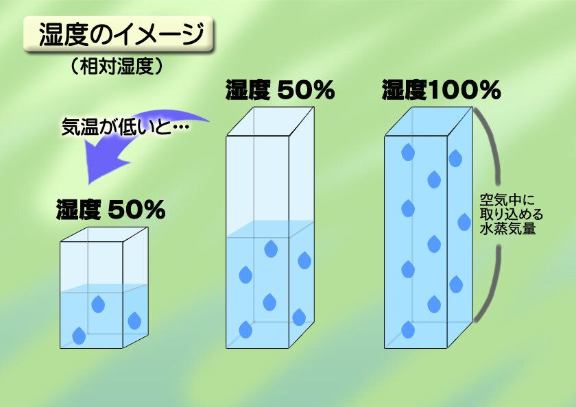 私たちが普段使う「湿度」は、正確には「相対湿度」という用語で、「空気中に含むことのできる水蒸気量に対して実際にどのくらい水蒸気があるのか」を表しています。