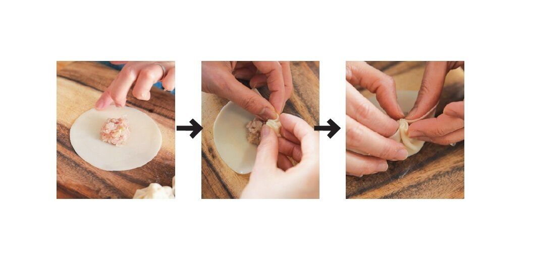 餃子の皮にあんを小さじ1くらいのせ、縁に水を塗る。細かくひだを寄せながら、てっぺんでまとめると本場っぽい!
