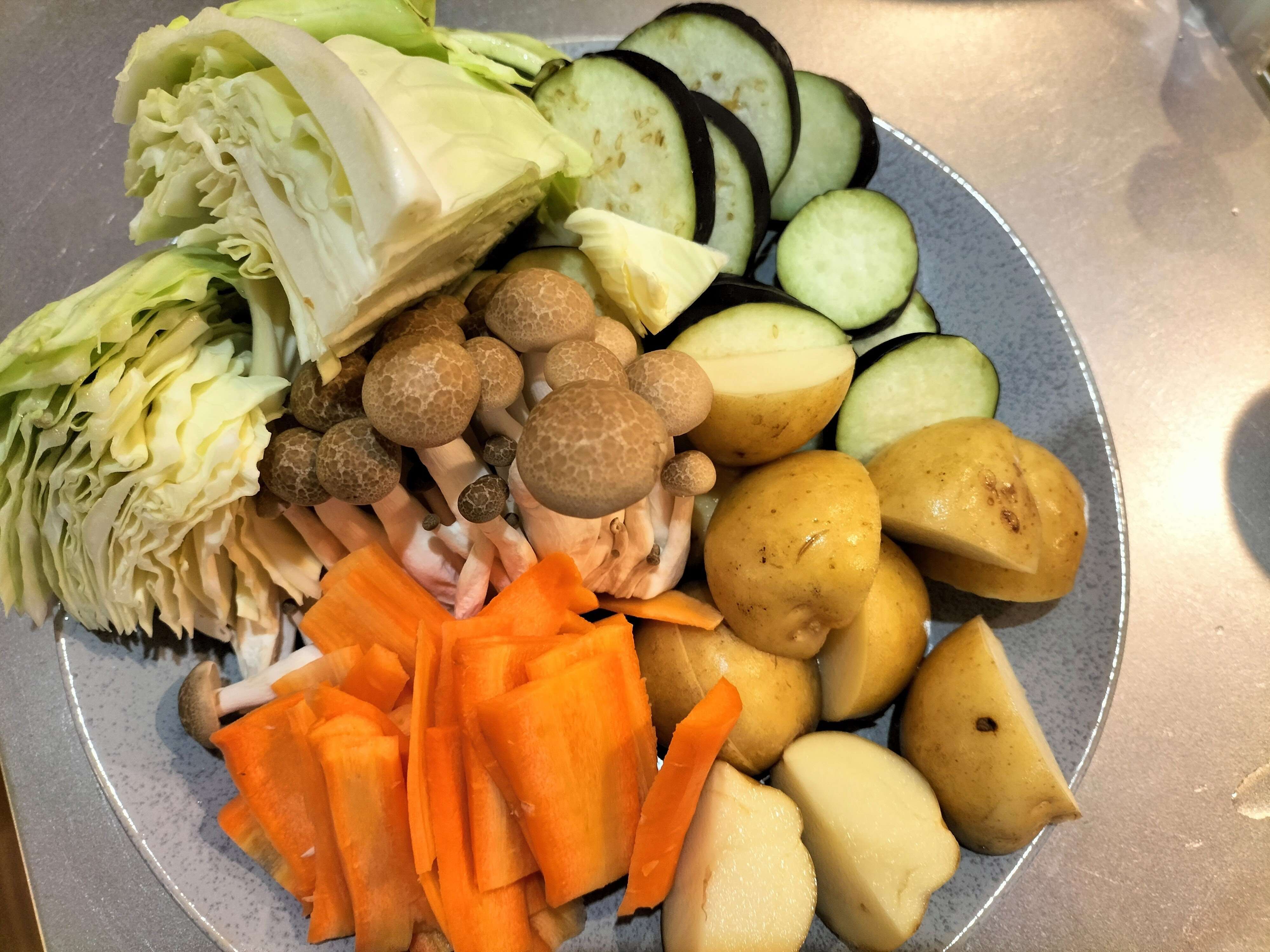 ・キャベツ、玉ねぎ、ナス、きのこ、豚肉などお好みの食材を入れる