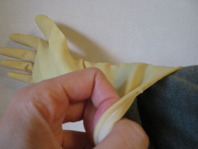 あまりのびないゴム手袋は、はめる時にもたつきがち。