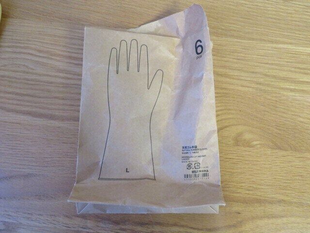 天然ゴムの手袋は安心。外袋も無漂白の紙製なので、生ごみ入れに再利用できそうですね。