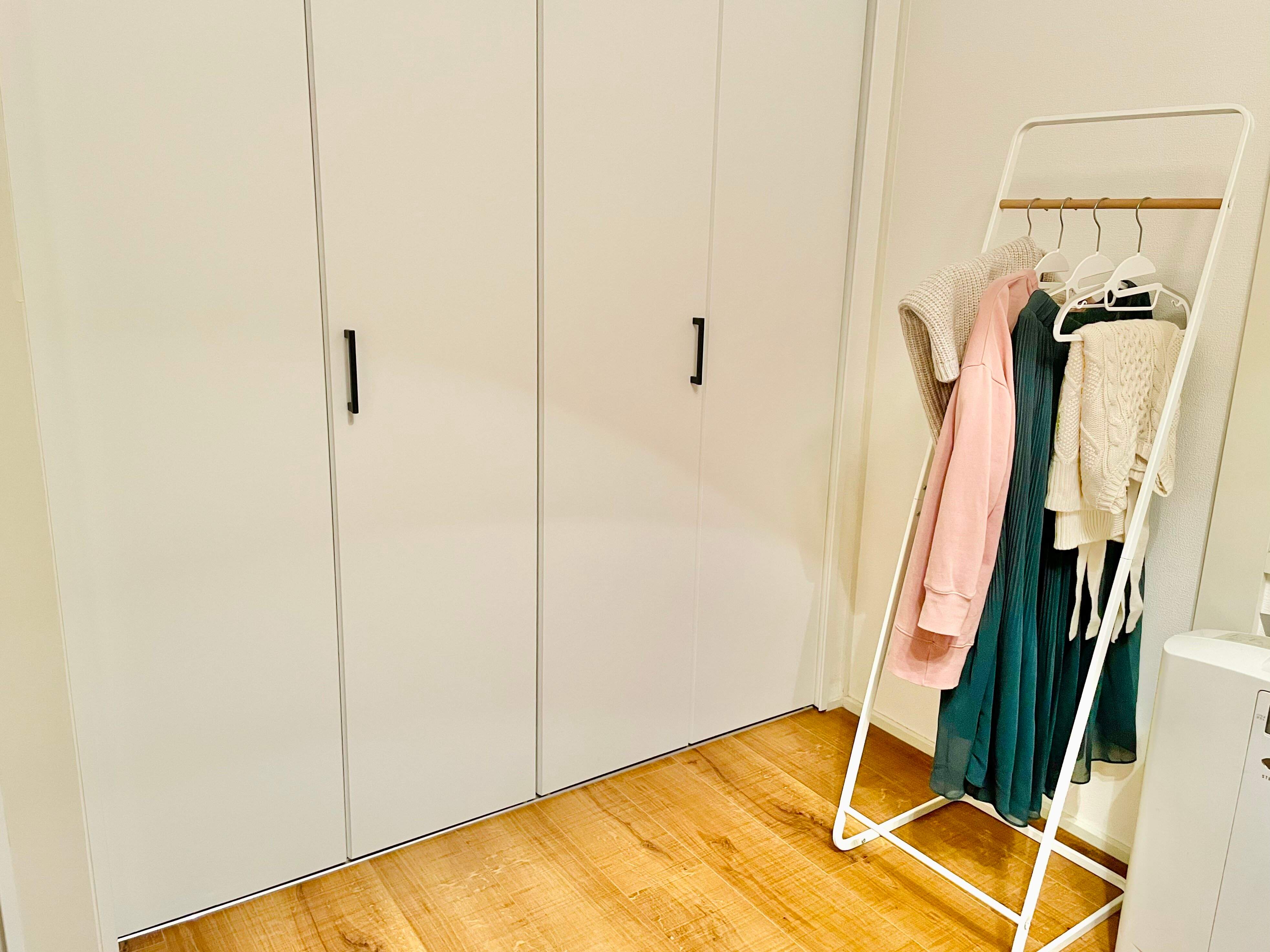 すぐには洗わない服は、クローゼット前の「一時置きコーナー」に。スリムタイプのコートハンガーを設置して、かける収納にしています。