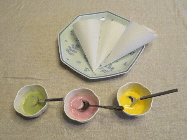 しぼり袋がついていないので、直角二等辺三角形に切ったクッキングシートを丸めてコルネをつくりました。