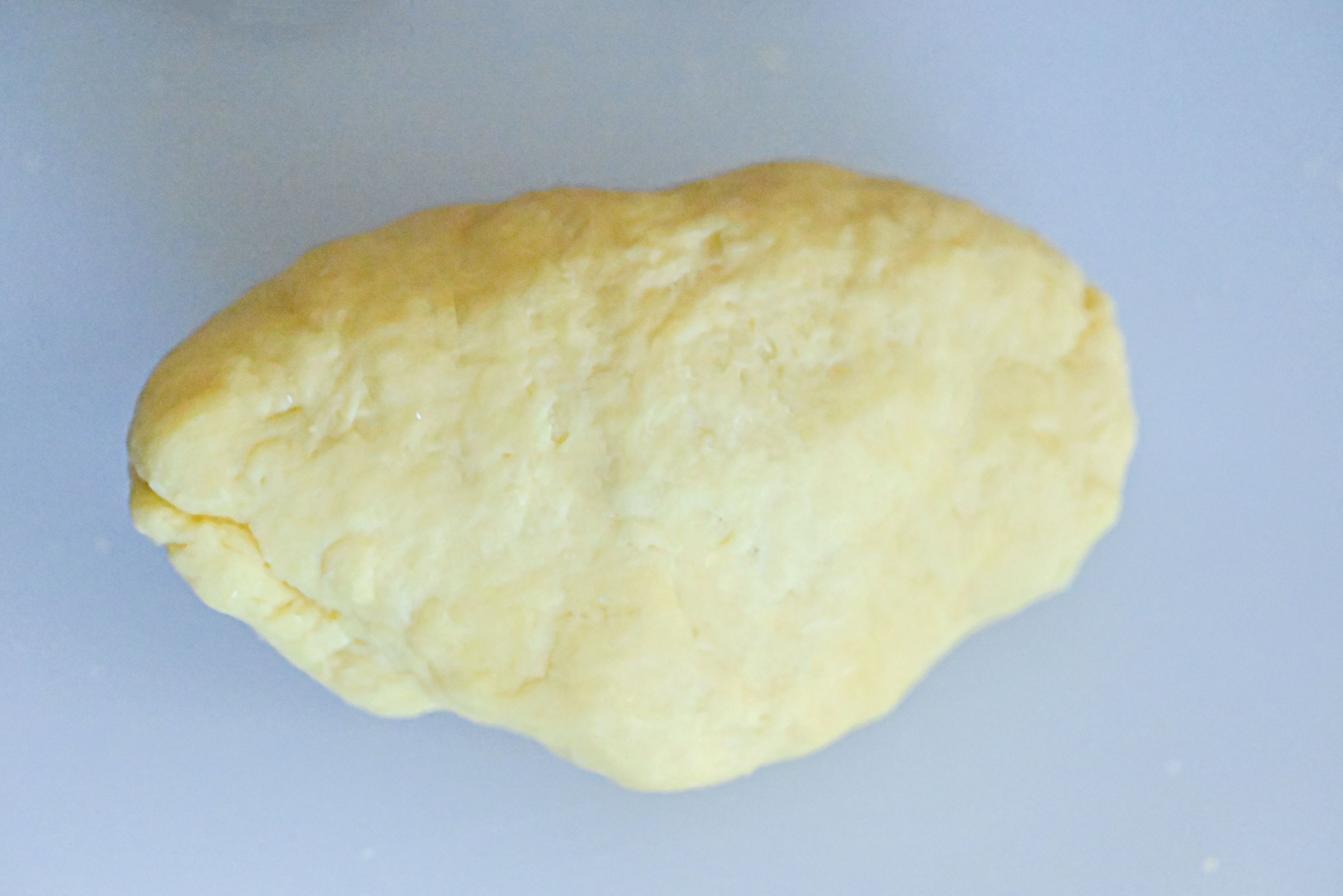(3)台に取り出し、生地を外側から中央に折り返し、両手で体重をかけて表面が滑らかになるまで5分ほどこねる。