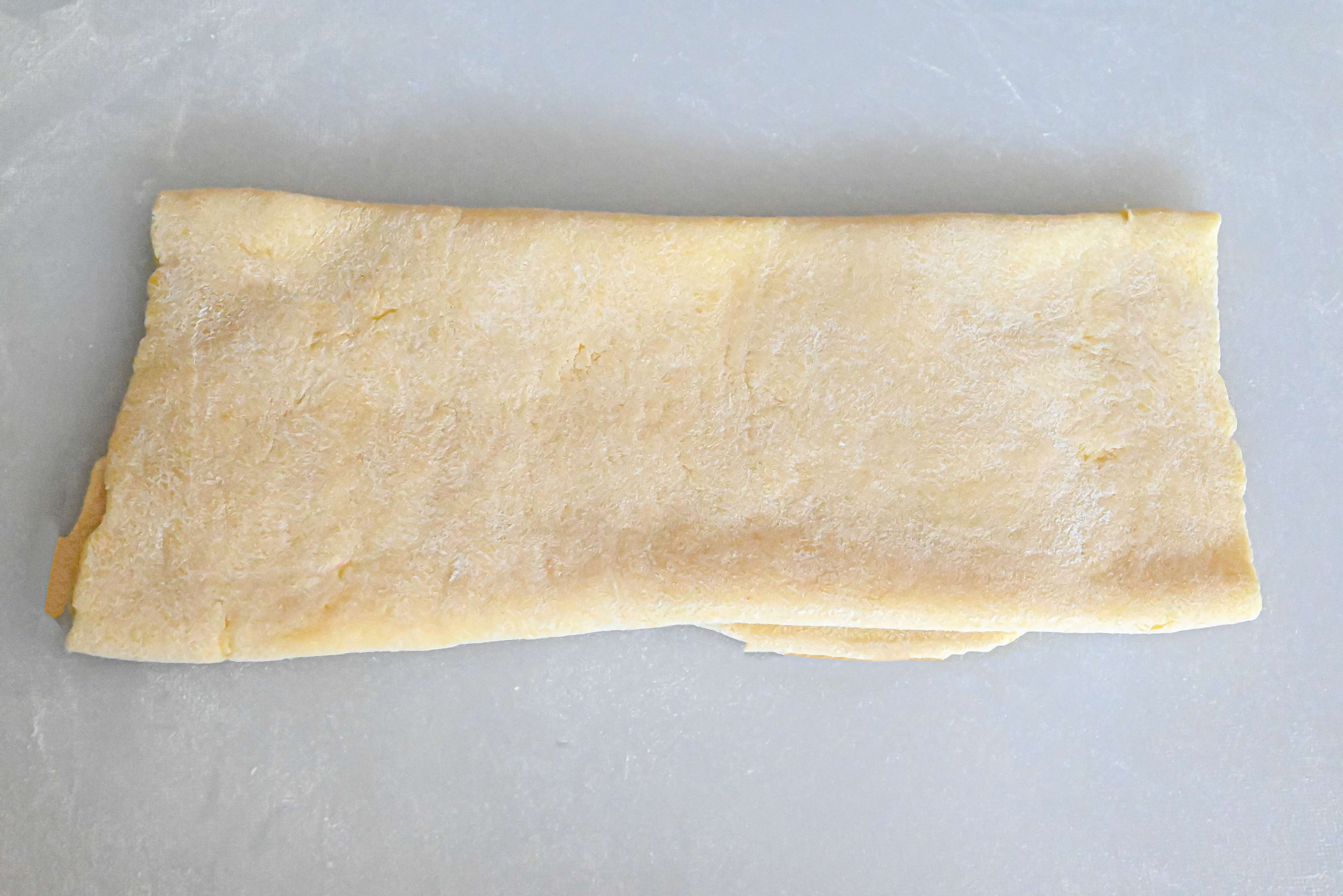 (5)打ち粉をし、厚さ1mmになるまでめん棒でのばし、3つ折りにする。