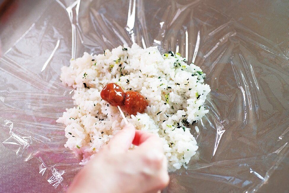 「仕事中に片手で食べられるから」と夫におにぎりをリクエストされて以来、夫のお昼は毎日、大きなおにぎり2個。ミートボールやウインナーなどの具をつまようじでのせ、ラップで包めば洗い物もゼロ。