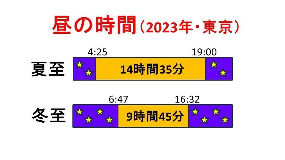 一年で最も昼が長い夏至と、最も昼が短い冬至とで太陽が出ている時間を比べてみると、東京では約5時間も差があるんです。