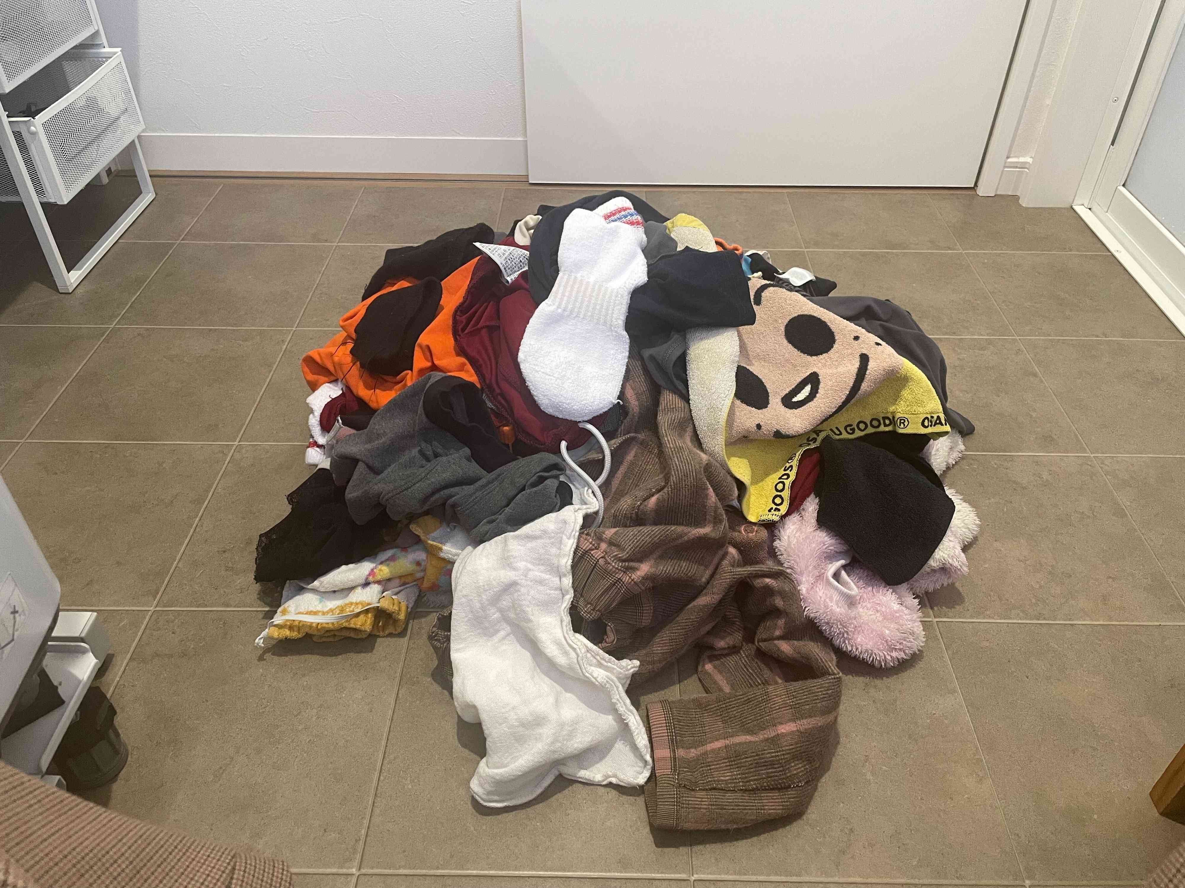 乾いた衣類を床置きに変更したわが家。そうなると、少しでも早く畳まないと子どもたちに踏まれせっかくの衣類がまた汚れてしまいます。畳まなくていいものを増やしたい一心に、「使用頻度が高い」「シワにならない」この2つを意識。