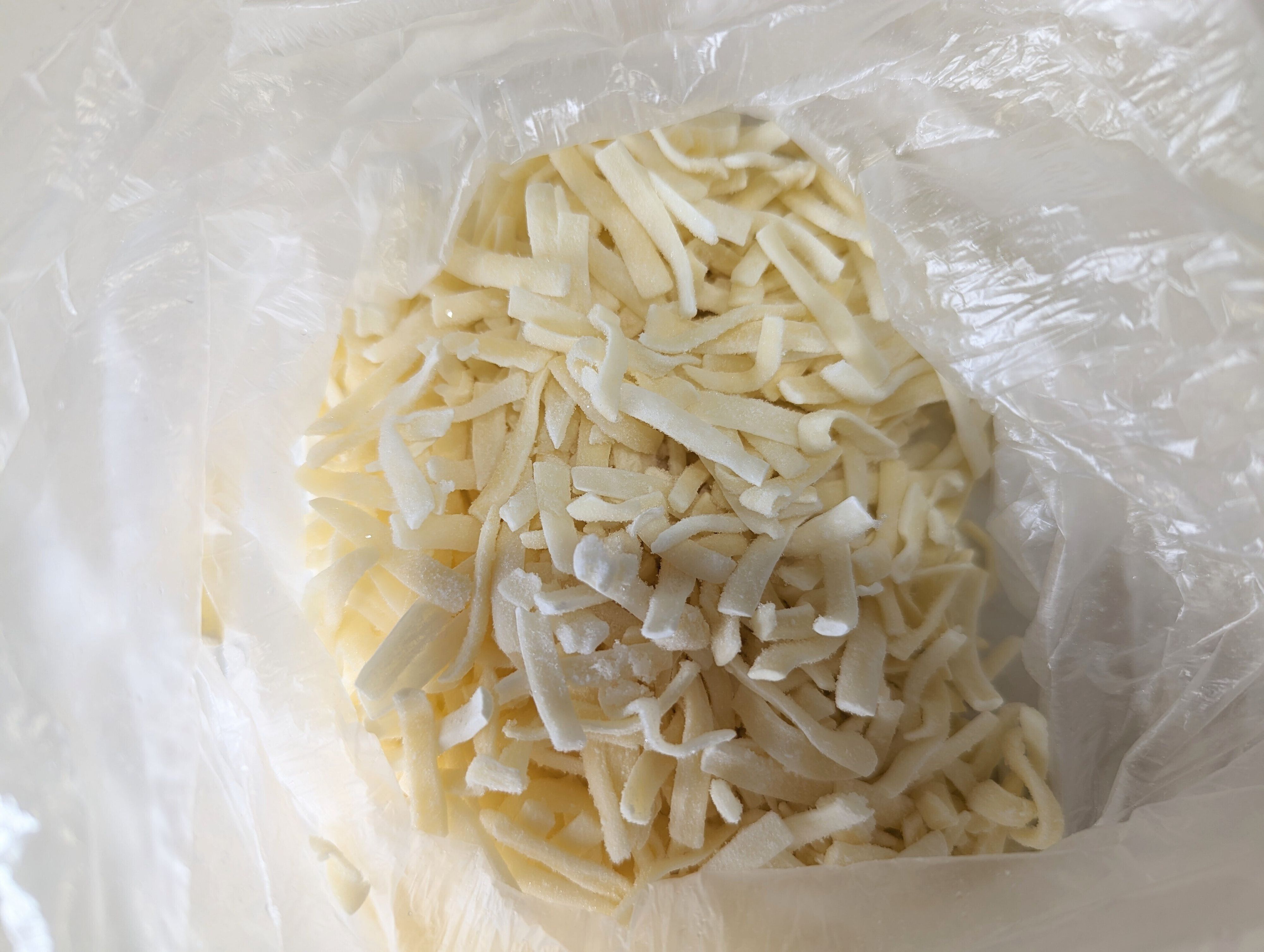 わが家の常備食材のひとつ、シュレッドチーズ。約500g入りを買いますが、一度に使い切ることはまれ。残った分は冷凍保存して、都度必要な量を取り出して使っています。