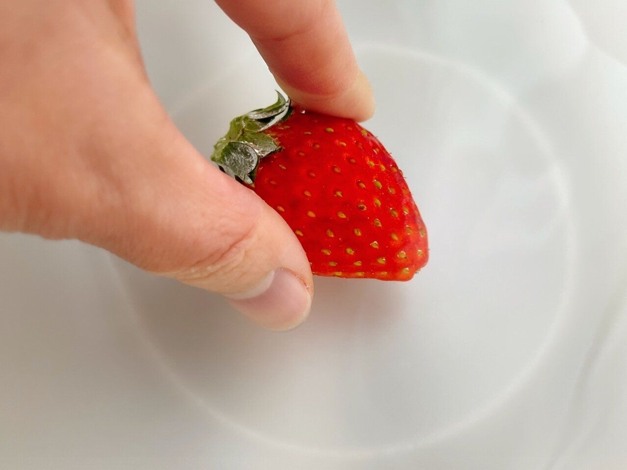 いちごを洗う場合は、水をはったボウルの中でいちごをやさしくふり洗いをします。