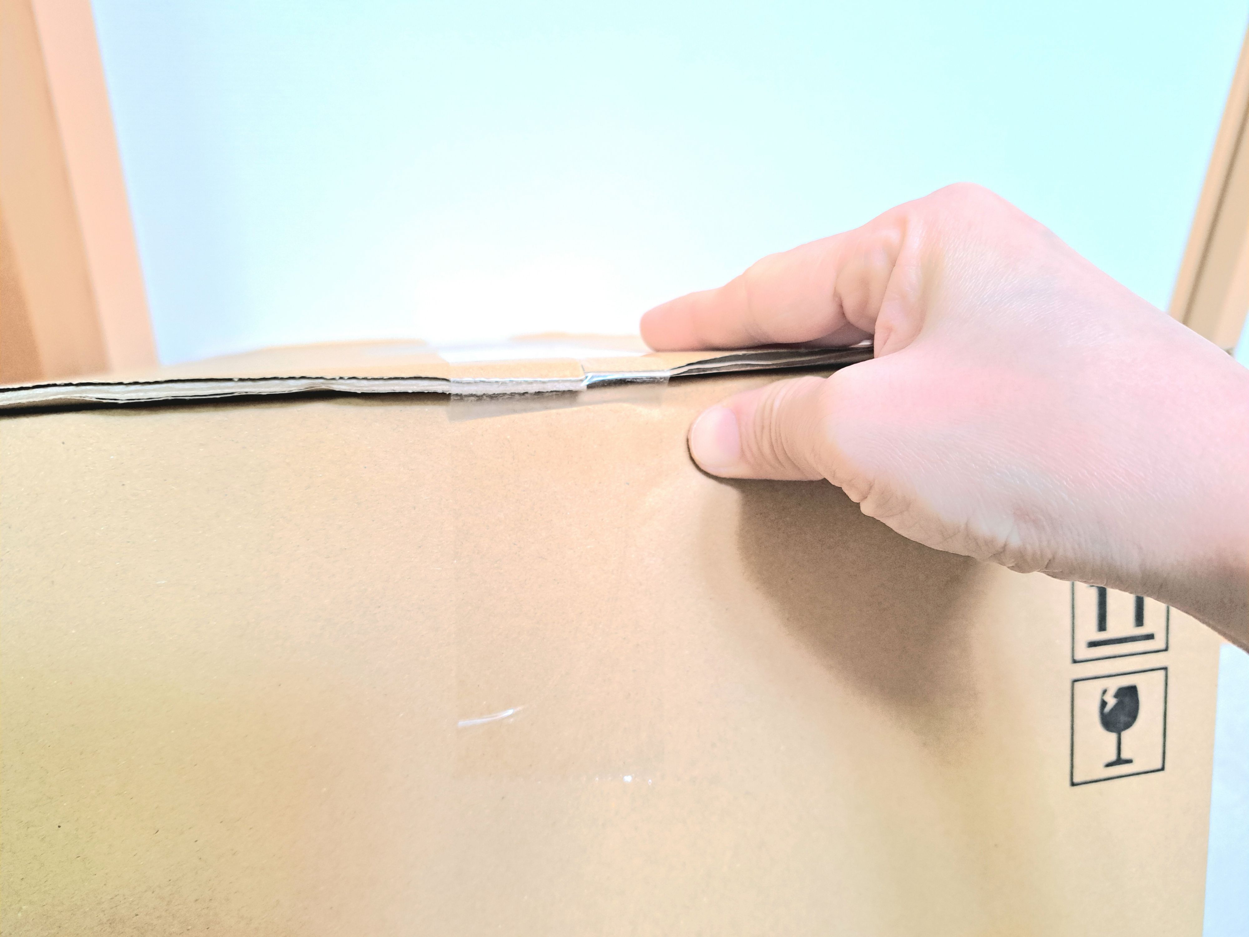 そして、テープの横をグッと指で押して、ダンボールを少し奥に動かします。すると、テープに隙間ができるんです。