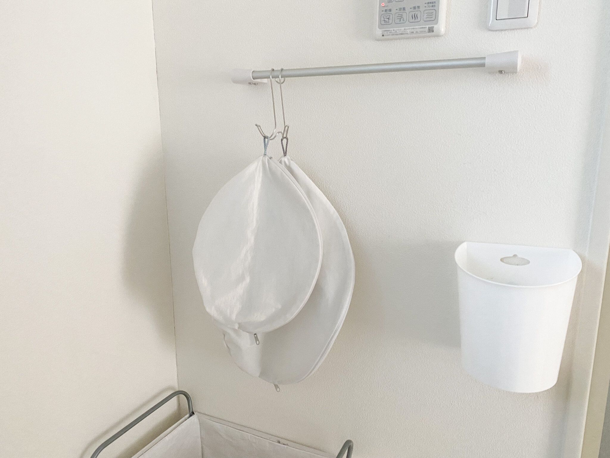 家に帰ってきたら浴室乾燥で乾いた小物類を畳み収納します。靴下などペアのものを畳むときも、吊るした状態で畳む作業を行うので見つけやすくこれも時短になります。