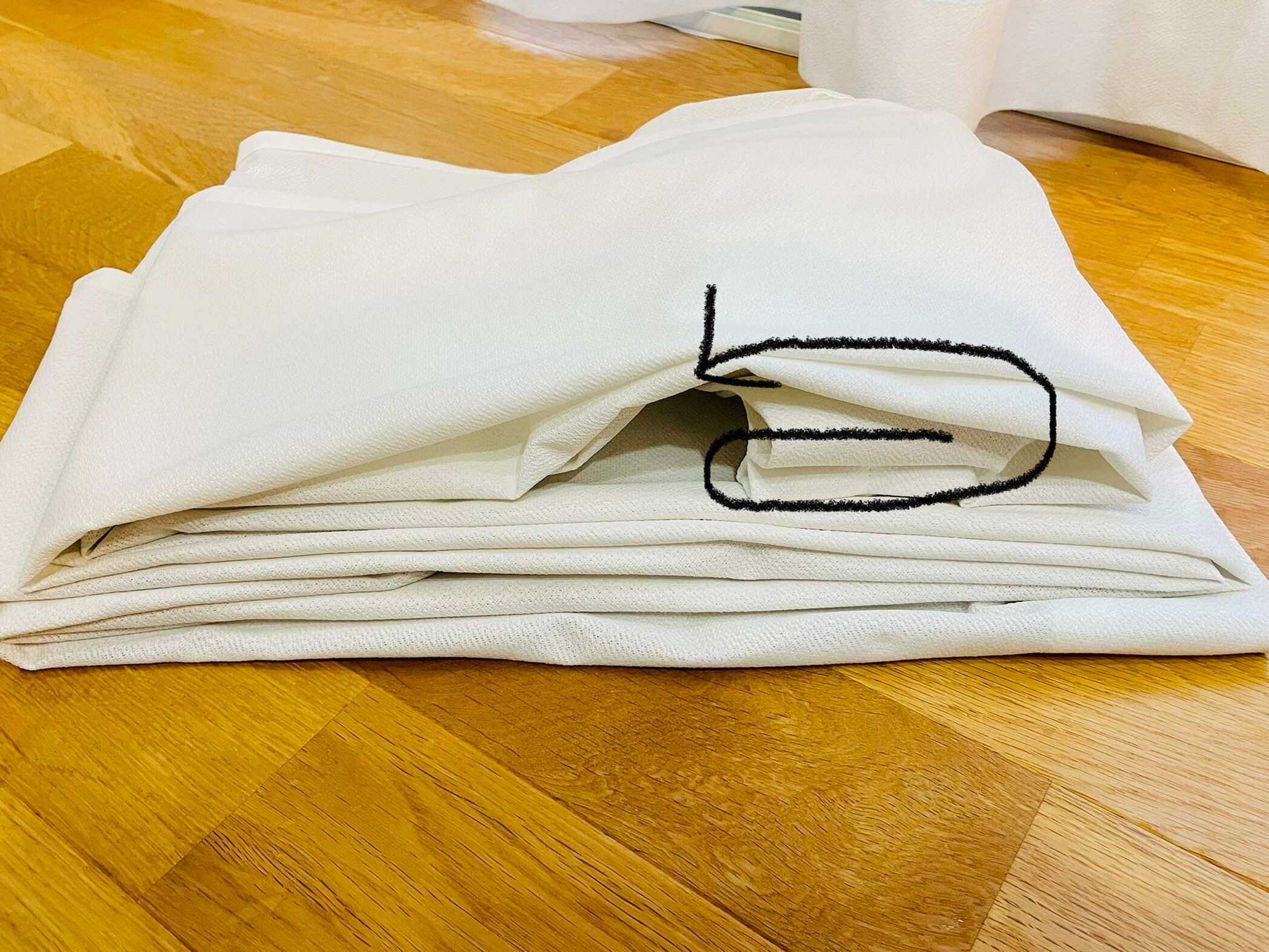 カーテンのひだに沿って、縦にジャバラに折りたたみます。折りたたんだら、次は横にジャバラ折り。