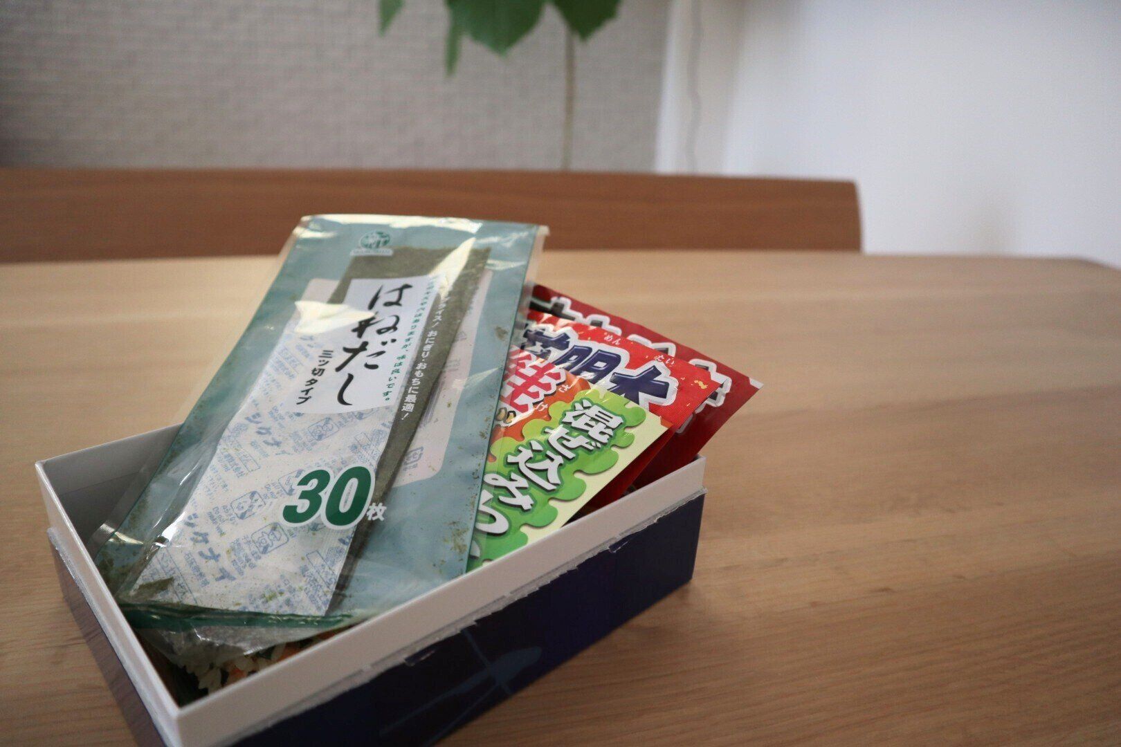 個包装のクッキーなどが入っていた洋菓子の空き箱には、おにぎりを作る際に使うふりかけ類と海苔をまとめました。