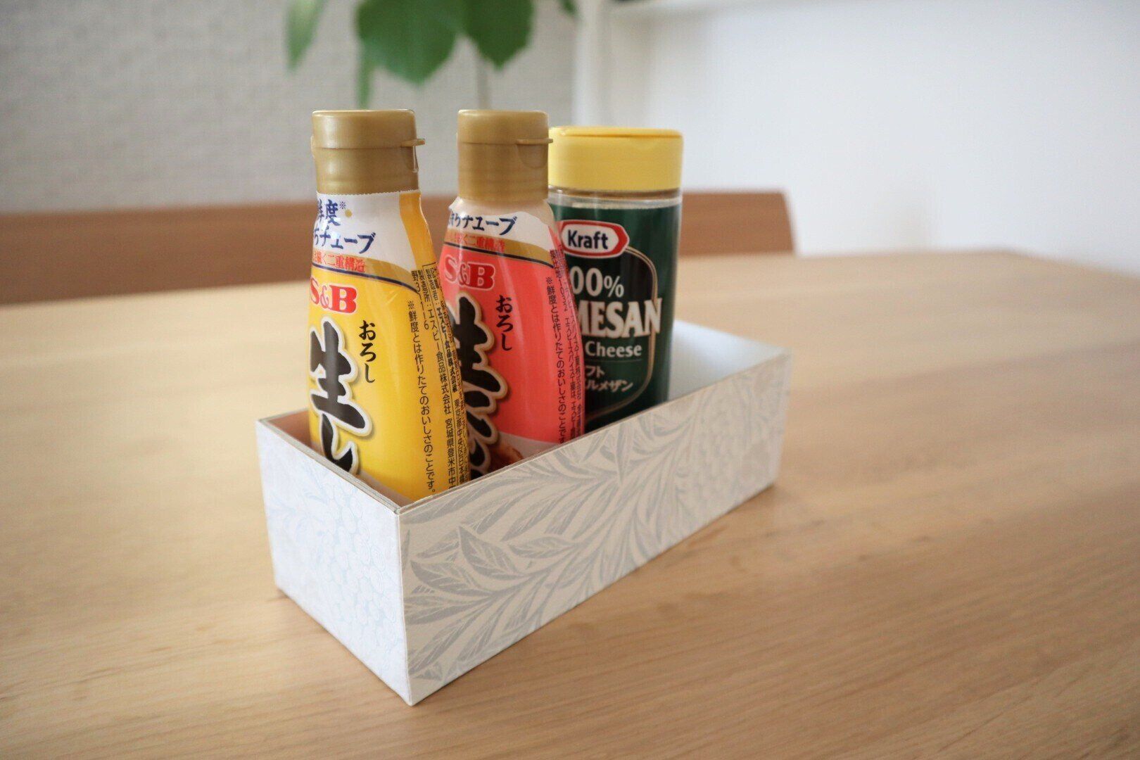 大容量の薬味チューブの収納には、少し深さがあり、細長い形状のBOXが便利です。今回私はパウンドケーキが入っていた箱を使いました。