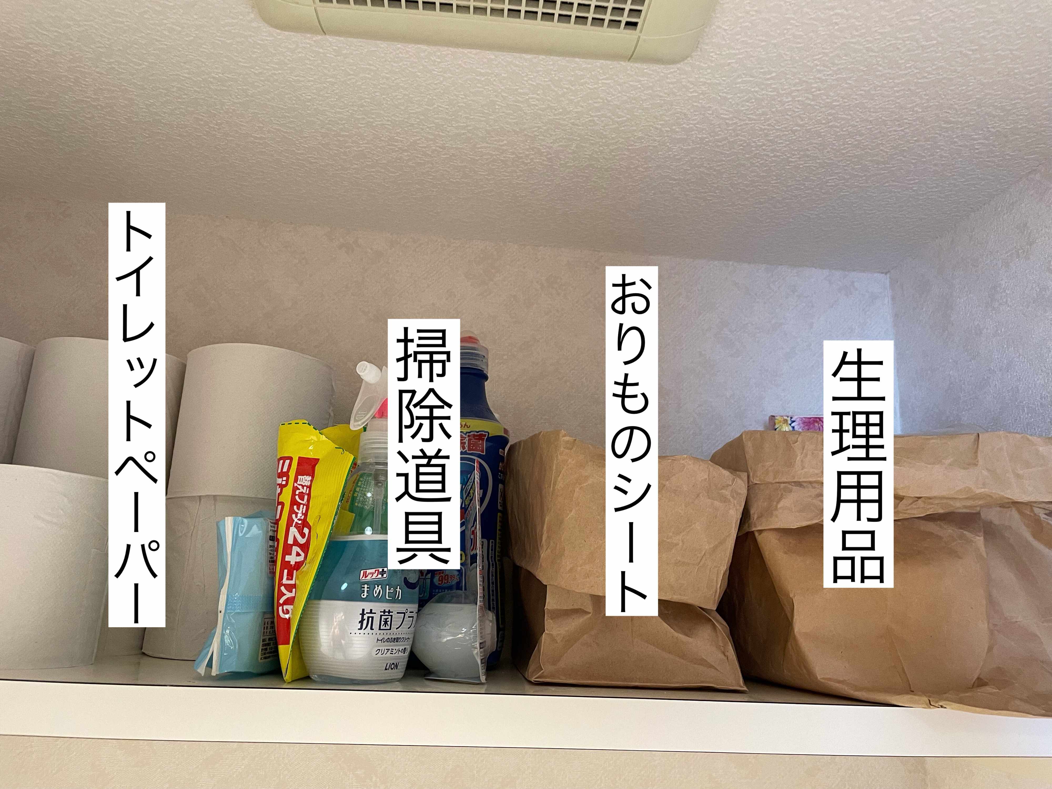 収納が少ないトイレでもパッと見ただけで必要なものが手に取れるように、「トイレットペーパー」「掃除道具」「おりものシート」「生理用品」と大まかにジャンル分けしています。