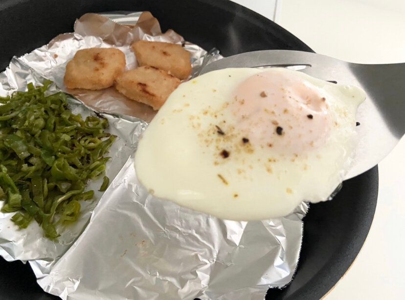 朝ごはんを作るときは、軽く折り目をつけて目玉焼きが他の食材とくっつかないように簡易分割させて便利に使っています。