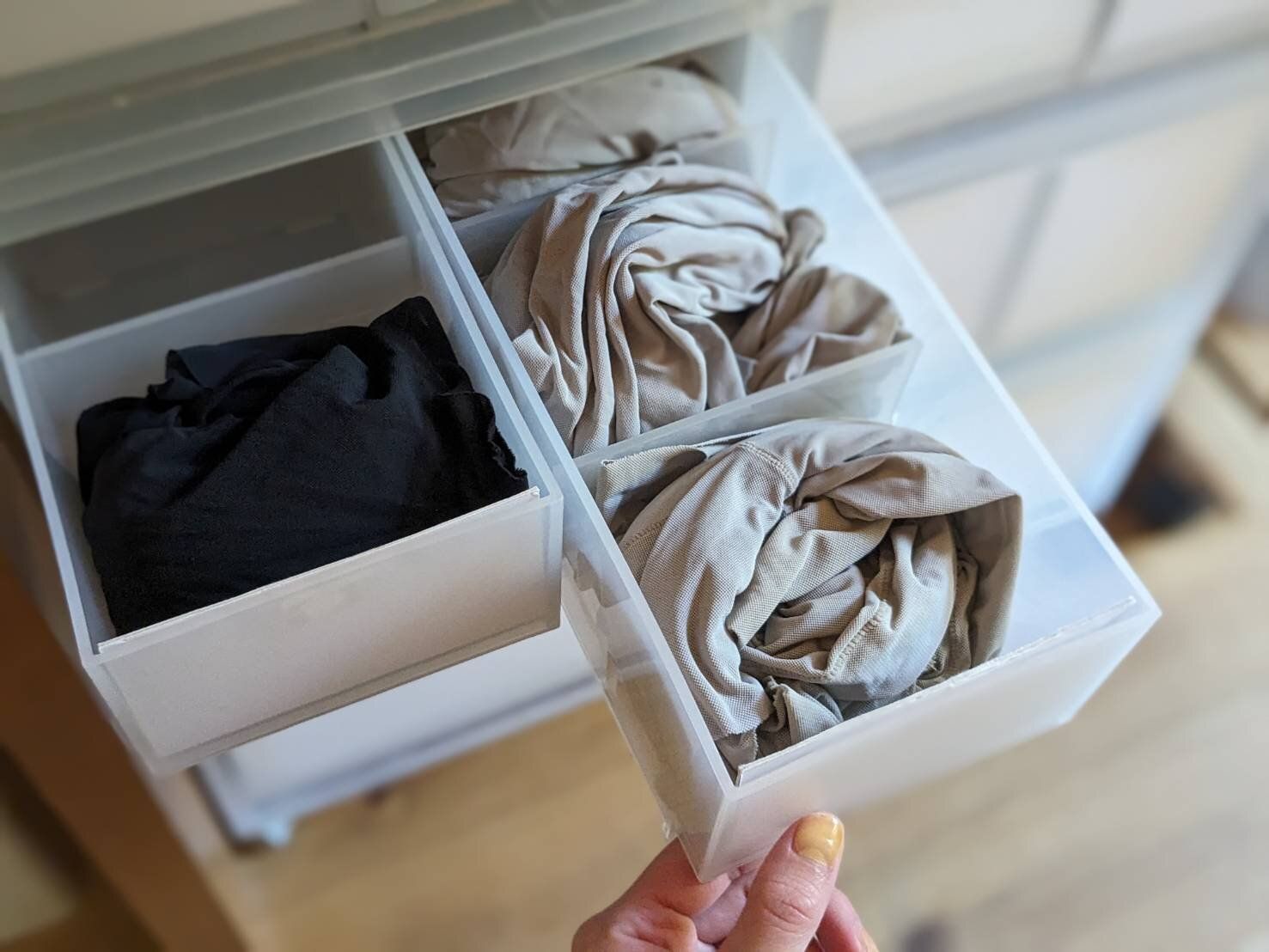 ベビー服自体は小さいですが、吐きこぼしや汗をかいて日に何度もお着替えをしたり、おくるみを洗ったりと、赤ちゃんひとり増えるだけで想像以上に洗濯物が増えますよね。そこで、「いっそたたむのをやめてみたらどうだ」と、たたまなくてもOKなモノ探しを始めました。