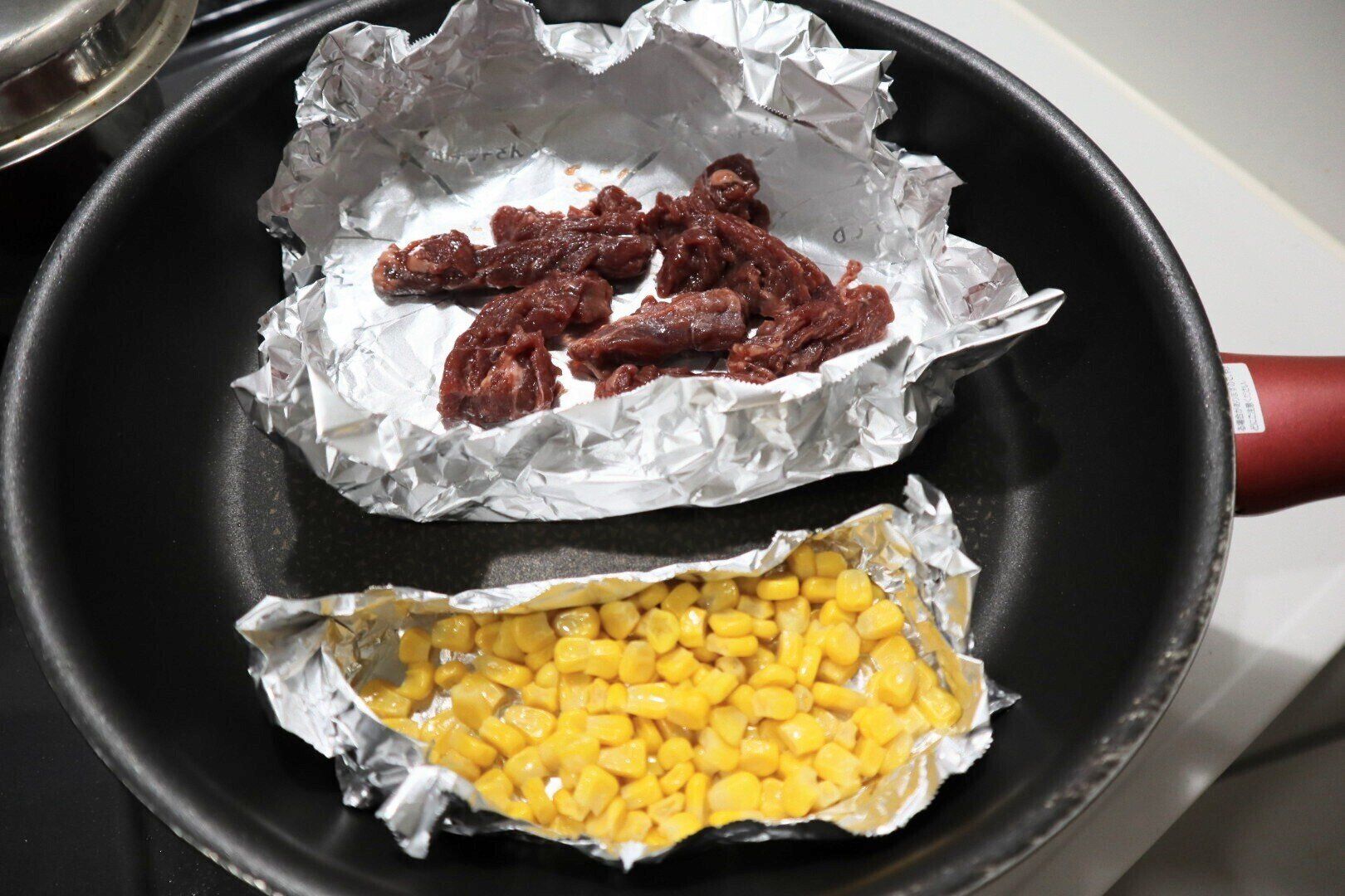 コーンやミックスベジタブルなど、バラバラになりがちな小さな食材は、フライパン用ホイルシートでの調理が終わったあと、それをそのまま器として使ってみましょう。