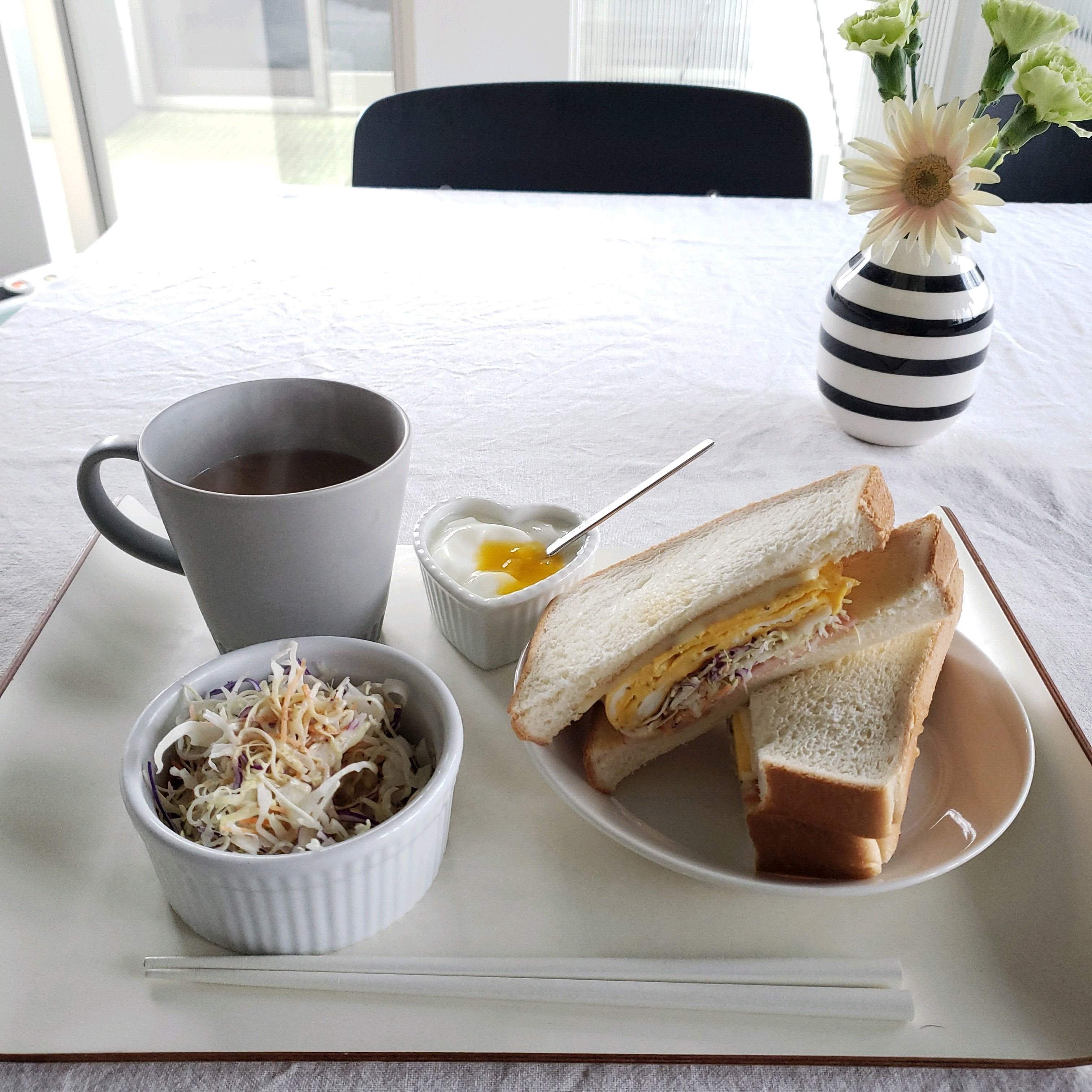 休みの日はゆとりがあるので、卵を焼いてハム、チーズ、カットサラダをサンドしています。