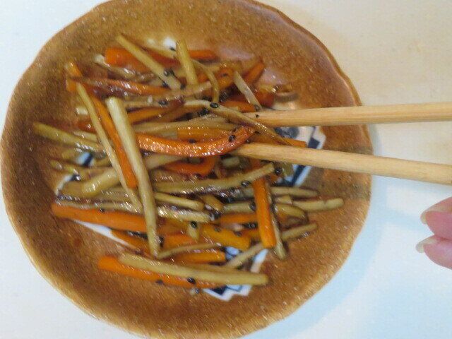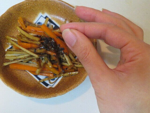 それならもうフライパンにごまをつけないようにすればいいではないかと、皿にきんぴらを盛った後にごまをふりかけてみることに。